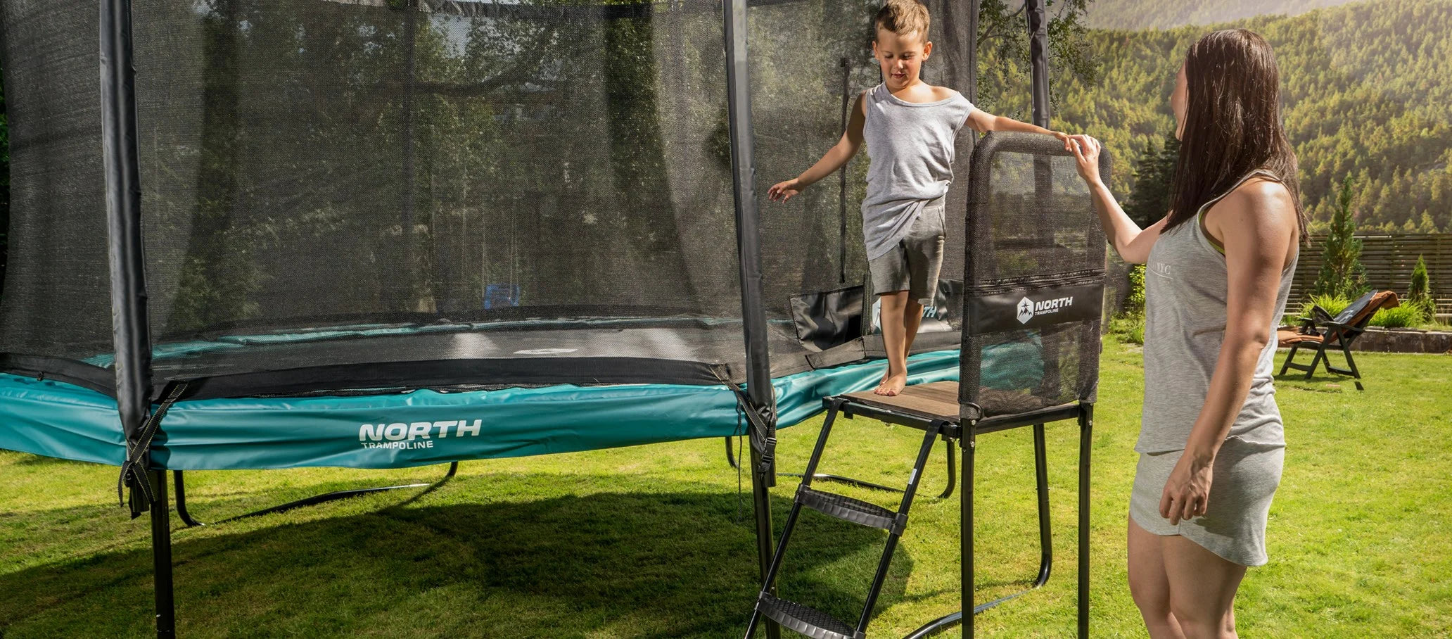 The North Base makes it easy to get up onto the trampoline. If you choose the slide, it makes coming down super fun! The base is equipped with a handy pouch which can be used to store keys, phones, etc. when you jump.